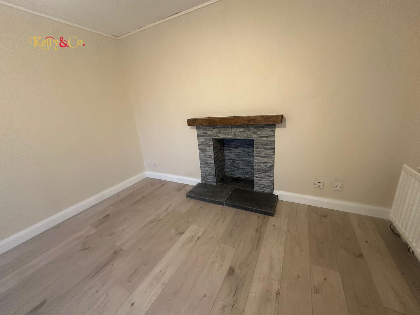 Wood laminate floor. Feature stone fireplace. View to front.