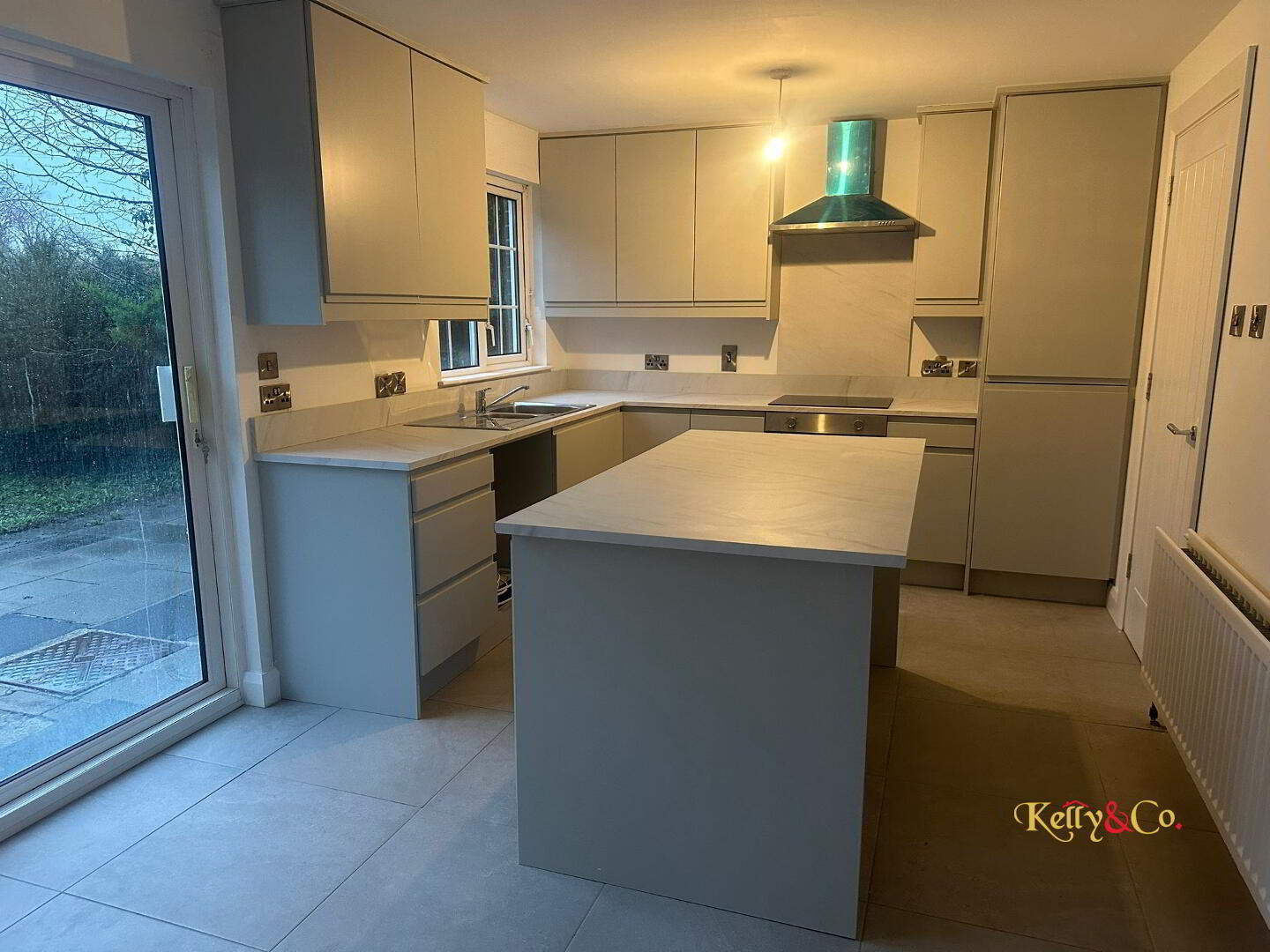 Recently fitted, modern "Dove grey solid painted handleless kitchen" with blum self closing doors and drawers, with matching upstands and worktops. Electric hob and oven with stainless steel extractor canopy. Island unit with storage. Plumbed for washing machine. Left for integrated fridge freezer.
