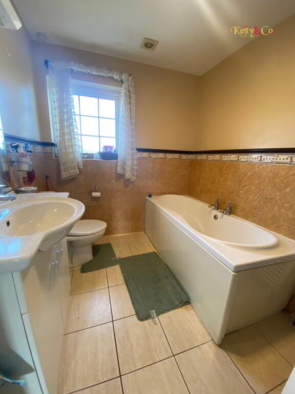 Bathroom: Tiled floor and part tiled walls. Bath. WC, WHB, Power shower.
