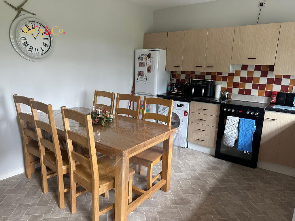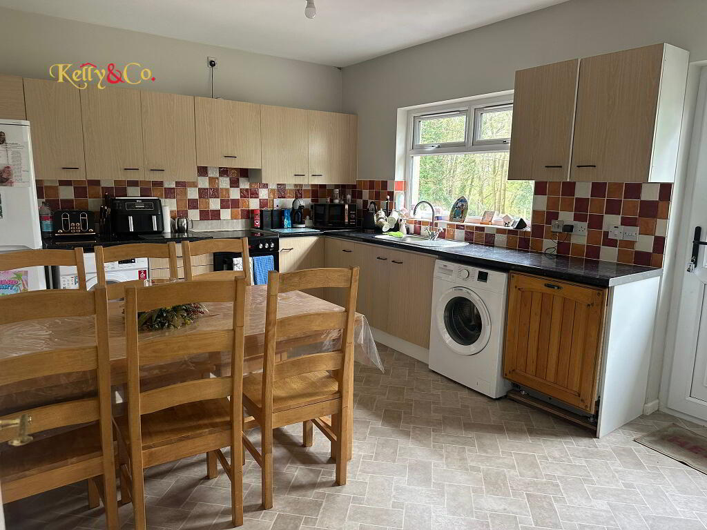 Range of eye and low level units. Space for free standing electric cooker. Space for fridge freezer. Plumbed for washing machine. Dining area within. Part tile walls.