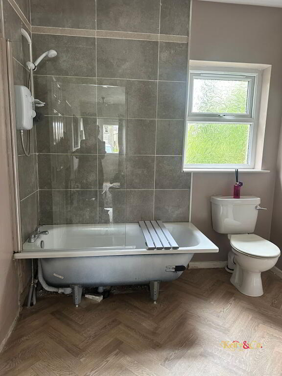 White suite comprising off: bath with electric shower over, wash hand basin, W.C. Tiled walls.